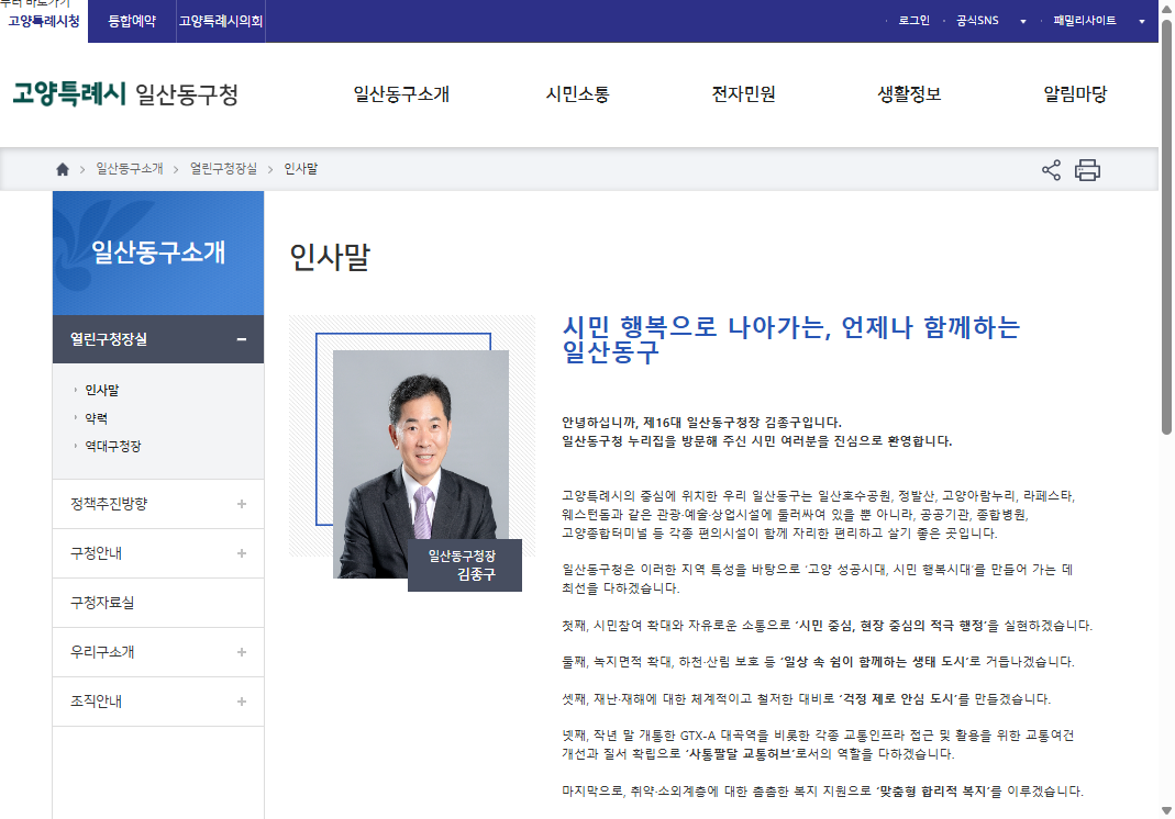 고양시 일산동구 김종구 구청장 홈페이지! 지금 바로 방문하여 당신의 소중한 의견을 들려주세요!